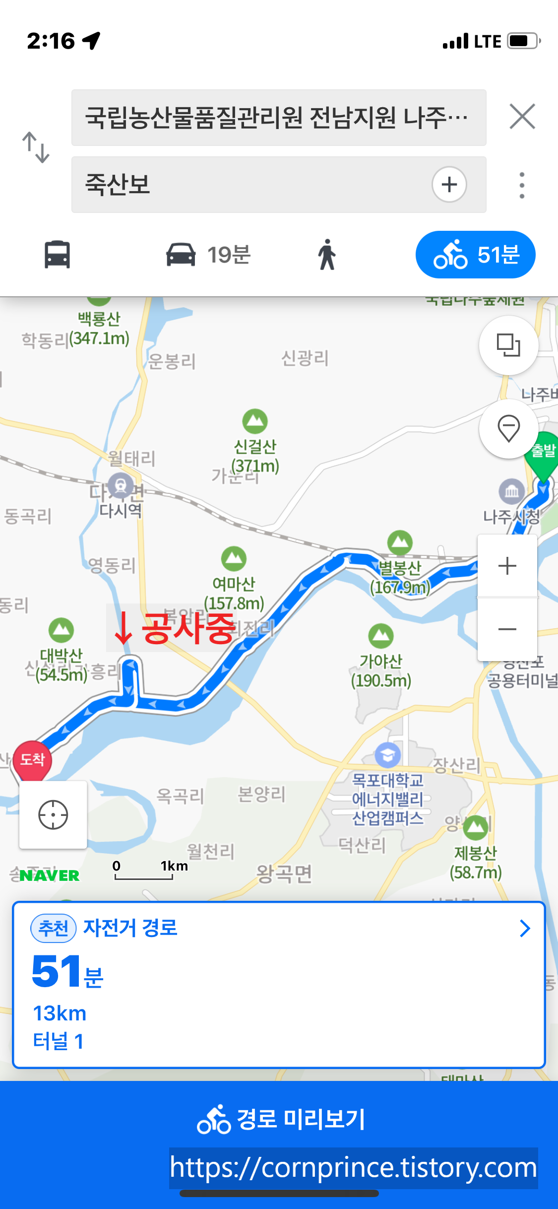 죽산보까지 가고 싶었는데, 아래 지도에 표시한 다리가 공사 중이어서 끊겼다. 아쉽지만, 복암리까지 갔다가 다시 돌아왔다.